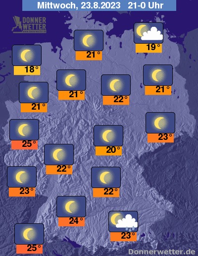 In den Abendstunden ist der Himmel verbreitet heiter oder die Sonne scheint von einem wolkenlosen Himmel. Im Norden des Landes können zeitweise auch mal Wolkenfelder durchziehen. Im südlichen Bergland sind einzelne Hitzegewitter möglich, sonst bleibt es meist trocken.