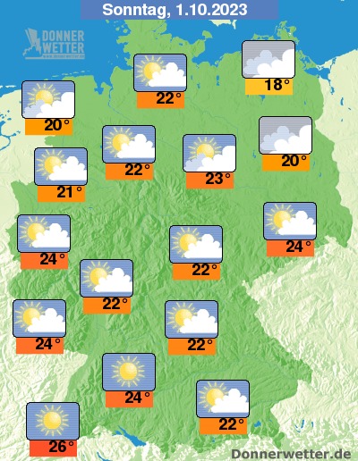 Am Sonntag ist es über dem Norden meist stark bewölkt, aber weitgehend trocken. Weiter nach Süden hin ist es dagegen verbreitet heiter bis sonnig, dabei bleibt es trocken. Die Temperatur erreicht 18 Grad auf Rügen und bis 26 Grad am Oberrhein.