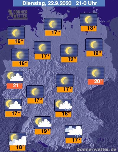 Bis Mitternacht dehnen sich die örtlichen Regengüsse im Süden bis nach Nordbayern aus. Sonst bleibt der Himmel klar oder nur leicht bewölkt.