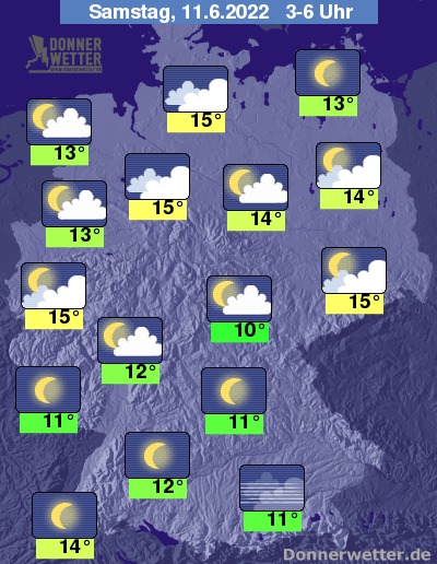 In der Nacht zum Samstag klingen letzte Schauer im Nordwesten rasch ab, über der übrigen Nordhälfte bleibt es bei teils starker, teils aber auch lockerer Bewölkung trocken. Im Süden ist es überwiegend sternenklar oder es ziehen nur wenige Wolken durch, dazu bleibt es trocken. Die Temperatur sinkt auf 15 Grad in Hamburg und 10 Grad in Jena.