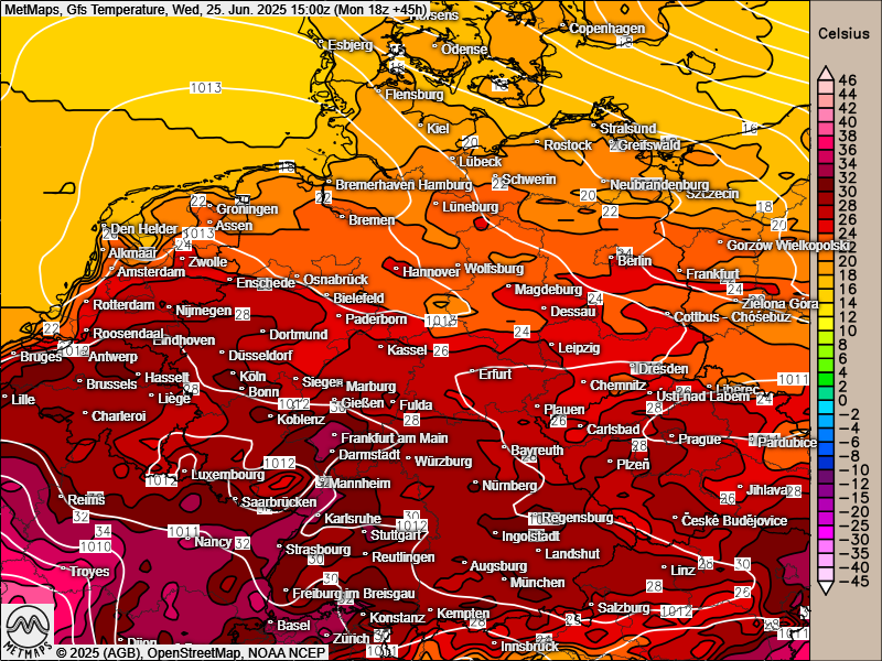 Die Karte zeigt die Deutschlandtemperaturen (GFS) am Mittwochnachmittag (15:00 Uhr):