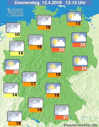Am Nachmittag liegen die Höchsttemperaturen dann verbreitet bei Werten um die 20 Grad. Wesentlich kühler bleibt es vor allem an den Küsten und in den Mittelgebirgen des Südens. Im östlichen Sachsen sind hingegen bis zu 25 Grad möglich.