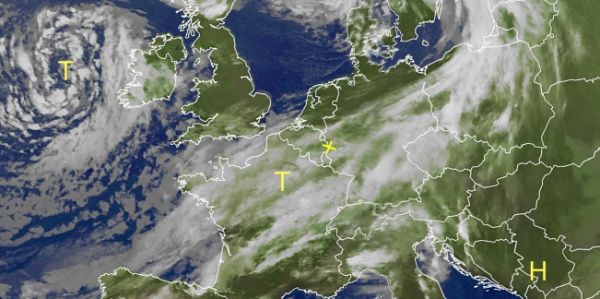 Auf dem aktuellen Satellitenbild ist vor den Britischen Inseln das steuernde Tiefdruckgebiet gut zu erkennen. Tiefausläufer bringen feuchte und warme Atlantikluft nach Deutschland.