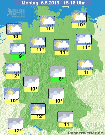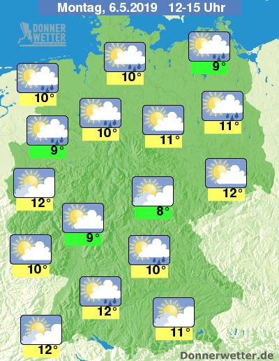 In den Mittags- und frühen Nachmittagsstunden zeigt sich der Himmel über weiten Landesteilen heiter bis wolkig oder aufgelockert bewölkt und vor allem in der Nordhälfte muss immer wieder mit Schauern gerechnet werden. Im weiteren Nachmittagsverlauf nimmt die Bewölkung dann verbreitet zu, heitere Phasen sind bis zum Abend dann meist nur noch in der Nord- und Nordosthälfte des Landes zu erwarten.
