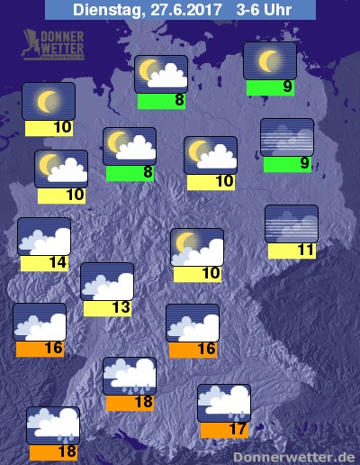 In der folgenden Nacht bleibt es über der Südhälfte Deutschlands überwiegend stark bewölkt, im Süden selbst bringen kompakte Wolken zudem vielerorts Schauer und einzelne Gewitter, sonst bleibt es hingegen weitgehend trocken. Weiter nach Norden hin zeigt sich der Himmel meist sternenklar und sonst nur locker bewölkt, dazu bleibt es trocken. Die Temperatur sinkt auf milde 18 Grad in Stuttgart und bis 8 Grad in der Norddeutschen Tiefebene.