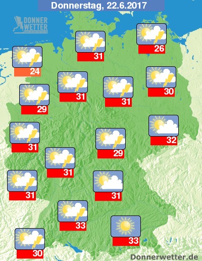 Am Donnerstag scheint zwischen meist nur lockeren Wolken zunächst häufig die Sonne, im Norden und Westen ziehen jedoch zunehmend auch dichte Wolken auf und hier sind verbreitet Schauer und zum Teil kräftige Gewitter möglich. Im weiteren Tagesverlauf verlagert sich mögliche Schauer und Gewitter weiter südostwärts, nur im Südosten selbst bleibt es voraussichtlich bis zum Abend hin trocken. Die Temperatur erreicht verbreitet schwülheiße Werte zwischen 29 und 33 Grad, an den Küsten ist es mit 24 bis 28 Grad deutlich frischer.