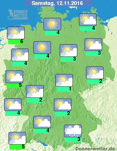 Am Samstag halten sich im Südosten dichte Wolken aus denen zeitweise Schnee oder Schneeregen fällt. Sonst ist es meist locker bis aufgelockert bewölkt und trocken. Oft sehr sonnig wird es über weiten Teilen des Nordens und auch im Nordosten Deutschlands, dazu bleibt es trocken. Die Temperatur erreicht 1 Grad in Mittelfranken und bis 6 Grad entlang der Ems.