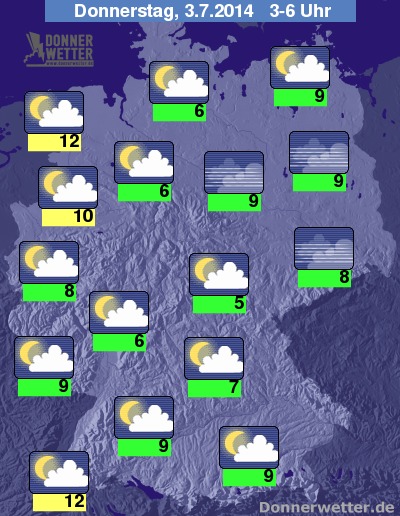 In der Nacht ziehen von Westen her lockere Wolkenfelder übers Land, häufig ist es auch klar, und es bleibt überall trocken. Die Temperatur sinkt auf 12 Grad in Oldenburg und 5 Grad im Vogtland.