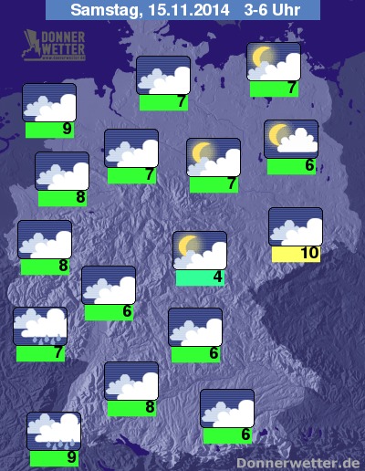 In der folgenden Nacht ist es im Süden und Westen stark bewölkt und im äußeren Westen kann hier und da auch etwas Regen fallen, sonst ist es zumeist trocken. Im Norden und Osten bleibt die Bewölkung häufig aufgelockert, teils ist sie jedoch auch stark, dazu bleibt es trocken. Vor allem im Süden des Landes kann sich hier und da Nebel oder Hochnebel bilden. Die Temperatur sinkt auf 10 Grad in Dresden und bis 4 Grad in den süddeutschen Mittelgebirgen.