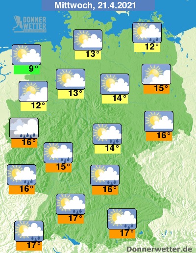 Am Mittwoch ist es zumeist heiter bis wechselnd bewölkt, vor allem über die Südhälfte ziehen aber auch oft dichte Wolken hinweg. Es bilden sich gebietsweise Schauer, örtlich auch Gewitter, im übrigen Land ist es meist trocken. Die Temperatur steigt auf 9 Grad an der Nordsee und bis 17 Grad im Breisgau.
