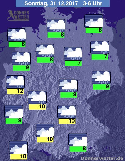 In der Nacht zum Sonntag ziehen dichte Wolken mit zeitweiligem und teils langanhaltendem Regen von Südwest nach Nordost. Gegen Morgen klingen die Niederschläge im Süden und Südwesten ab. Die Temperatur sinkt auf milde 12 Grad in Köln und bis 6 Grad in Neubrandenburg.