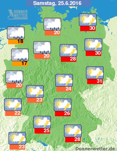 Am Samstag ist es über dem Bundesgebiet häufig stark, hier und da aber auch aufgelockert bewölkt, dabei können sich verbreitet Schauer und örtliche Gewitter entwickeln. Über dem Nordwesten bleibt die Wolkendecke weitgehend verschlossen, hier fällt zeitweise Regen. Die Temperatur steigt auf 17 Grad an der Ems und bis auf 31 Grad im südlichen Brandenburg.