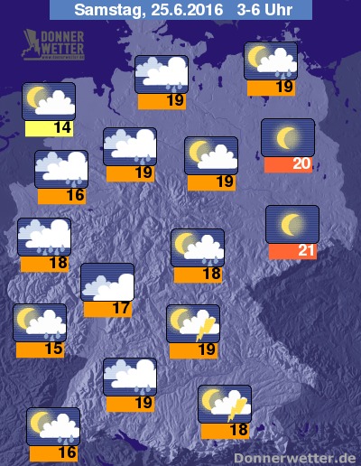 In der bevorstehenden Nacht bleibt es im Osten und auch im Südosten meist sternenklar und trocken. Gebietsweise kräftige Schauer und Gewitter bilden sich vom Süden bis nach Westdeutschland und weiter bis in den Norden Deutschlands. Über der Mitte des Landes ist der Himmel hingegen überwiegend nur locker, hier und da aber auch stark bewölkt, dabei sind nur selten Schauer und Gewitter möglich. Die Temperatur sinkt auf 21 Grad an der Neiße und bis 14 Grad an der niederländischen Grenze.