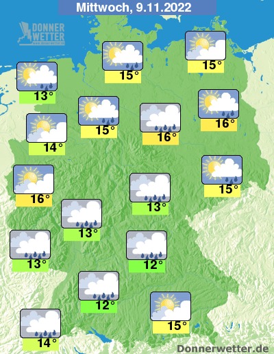 Am Mittwoch ist es überwiegend stark oder dicht bewölkt, vor allem im Nordwesten und Südosten zeigen sich vielerorts Auflockerungen. Jedoch sind im gesamten Bundesgebiet auch einzelne Schauer möglich. Die Temperatur steigt auf 12 Grad in Mittelfranken und bis 16 Grad im Rheinland. An der Nordsee ist es weiterhin oft stürmisch.