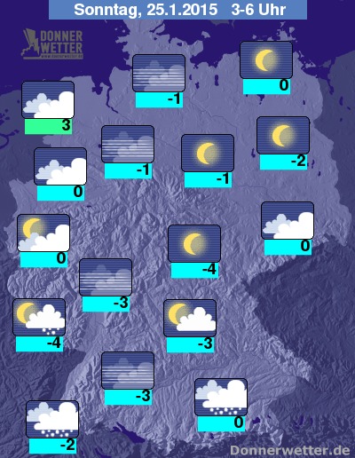 In der folgenden Nacht fällt besonders im Süden, aber auch im Osten anfangs noch Schnee, im Laufe der zweiten Nachthälfte lassen die Schneefälle dort meist nach und nur am Alpenrand schneit es weiterhin teils langanhaltend. In den anderen Landesteilen ist es dagegen häufig locker bewölkt oder auch sternenklar, gebietsweise aber auch trüb, stellenweise bildet sich Nebel. Im Westen und Nordwesten ziehen zum Morgen hin wieder dichte Wolken auf und es bilden sich Schnee-, Schneeregen- oder Regenschauer, sonst bleibt es weitgehend trocken. Die Temperatur sinkt auf 3 Grad im Ammerland und bis -4 Grad im Coburger Land.