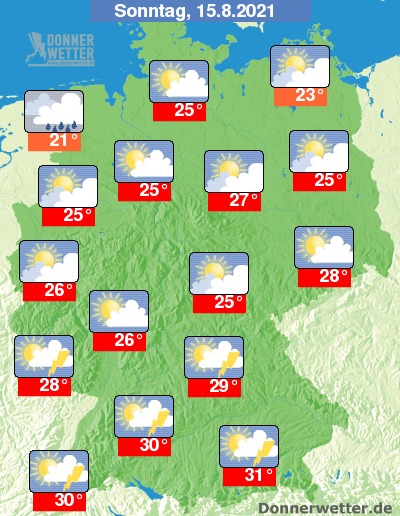 Am Sonntag ist es über der Nordhälfte des Landes häufig stark, hier und da aufgelockert bewölkt, dabei bleibt es weitgehend trocken. Weiter nach Süden hin ist es häufig heiter bis sonnig, teils ziehen einige Wolken auf, dabei besteht ein geringes Gewitterrisiko. Die Temperatur steigt auf 21 Grad in Emden und bis 31 Grad in München.