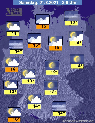 In der kommenden Nacht zeigt sich der Himmel über Deutschland häufig sternenklar, vor allem im Norden, aber auch im übrigen Land können auch mal dichte Wolken durchziehen, dazu bleibt es aber trocken. Die Temperatur sinkt auf 16 Grad im Rheinland und bis 12 Grad im Vogtland.