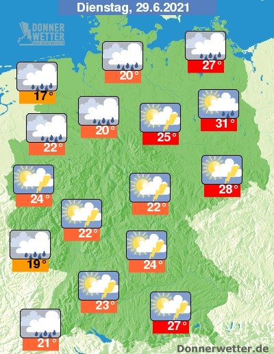 Am Dienstag ist es teils dicht, teils aufgelockert bewölkt, dabei können sich wiederholt Schauer und auch örtliche Gewitter entwickeln. Die Temperatur steigt auf 17 Grad an der Nordsee und bis zu 31 Grad in Berlin.