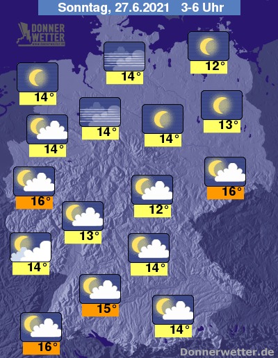 In der folgenden Nacht lockert und klart der Himmel über dem Bundesgebiet verbreitet auf, dazu bleibt es trocken. Die Temperatur sinkt auf 16 Grad entlang des Rheins und bis 12 Grad an der Müritz.