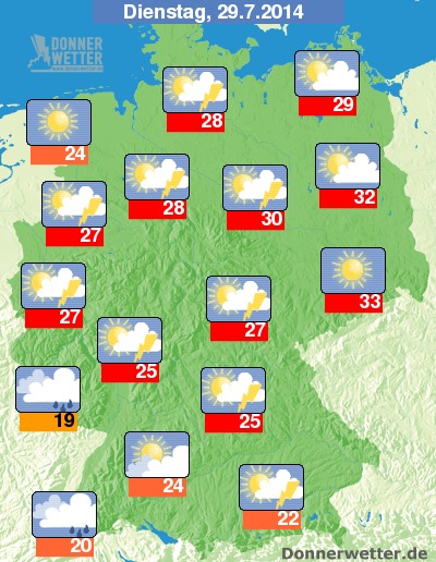 Am morgigen Dienstag herrscht wiederum verbreitet wechselhaftes Sommerwetter mit gebietsweise noch häufigem Sonnenschein am Vormittag und besonders am Nachmittag zum Teil schweren Gewittern mit Unwetterpotential. Überwiegend trocken und auch sehr freundlich bleibt es voraussichtlich im gesamten Küstenumfeld. Die Tageshöchstwerte erreichen nur kühle 19 Grad am Hunsrück und schweißtreibende 33 Grad in der Lausitz.