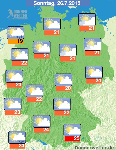 Am Sonntag ist es zunächst meist heiter oder sonnig, gebietsweise ziehen auch einige Wolken durch, dabei bleibt es aber trocken. Gegen Abend werden die Wolken von Westen her zahlreicher und auch dichter, dabei kann es im Westen und Südwesten des Landes nachfolgend auch regnen, sonst bleibt es aber weitgehend trocken. Die Temperatur steigt auf 19 Grad an der Nordsee und bis 25 Grad am Bodensee.