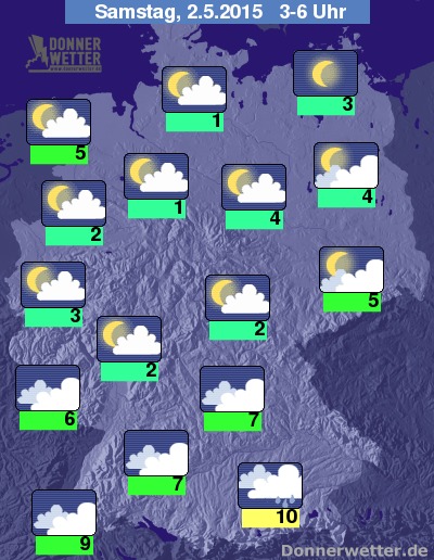 In der folgenden Nacht bleiben die Wolken im Süden der Republik weitgehend dicht, dabei fällt auch weiterhin zeitweise Regen. In den nördlicher gelegenen Landesteilen ist es hingegen meist locker bewölkt oder sogar sternenklar und es bleibt trocken. Die Temperatur sinkt auf 10 Grad in München und bis 1 Grad im Weserbergland.
