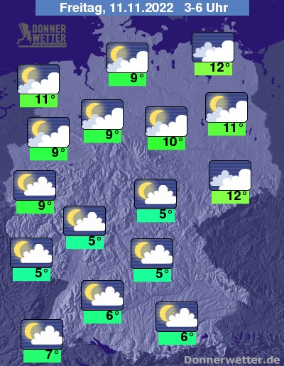 In der Nacht zum Freitag bleibt es über dem Norden und Osten Deutschlands teils aufgelockert, oft jedoch stark bewölkt. Im übrigen Land ist der Himmel jedoch mehrheitlich nur locker bewölkt, teils ziehen auch einige Wolken durch. Es bleibt bundesweit trocken bei Tiefstwerten von 12 Grad in Neubrandenburg und etwa 5 Grad in Nürnberg.