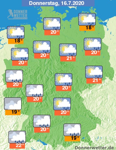 Am Donnerstag bleibt es vor allem im Süden und Osten oft stark, zum Teil auch aufgelockert bewölkt, dabei bilden sich hier zeitweise Schauer, örtlich entwickeln sich auch Gewitter. Im übrigen Land ist es teils heiter, teils ziehen dichte Wolken durch, dabei sind einzelne Schauer möglich. Die Temperatur erreicht etwa 18 Grad an den Küsten und bis 22 Grad im Oberrheingraben.