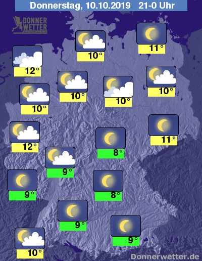 Bis Mitternacht trocknet die Luft verbreitet ab und insbesondere im Süden klart der Himmel verbreitet auf. Sonst wechseln sich Mond und Sterne mit lockeren Wolkenfeldern ab.