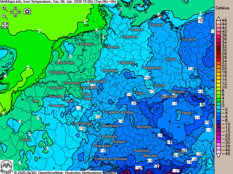 Die Temperaturen erreichen am Nachmittag Höchstwerte um -7 Grad am Alpenrand und bis +2 Grad an der Nordseeküste.
