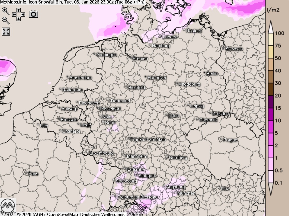 Die Temperaturkarte sowie die Sechs-Stunden-Schneemengen bis 23:00 Uhr nach ICON: