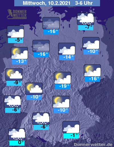 In der folgenden Nacht fällt vom Osten bis in den Nordosten verbreitet Schnee. Im Süden und Südwesten ist es ebenfalls meist bedeckt und es fällt hier gebietsweise Schnee. Im übrigen Land ist es oft aufgelockert bewölkt, teils s auch sternenklar und meist trocken. Die Temperatur sinkt auf 2 Grad in Freiburg und auf extrem kalte -16 Grad im Norddeutschen Tiefland. Im Thüringer Wald sind Tiefstwerte um -20 Grad möglich.