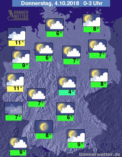In der Nacht zeigt sich der Himmel über dem Bundesgebiet meist locker oder aufgelockert bewölkt, in Küstennähe können dichtere Wolken auch mal einzelne Schauer bringen. Im Südwesten kann sich im Nachtverlauf regional Nebel bilden.