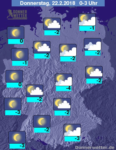 In der Nacht zeigt sich der Himmel auf einem Streifen zwischen Ostfriesland und dem Schwarzwald sternenklar, in den übrigen Landesteilen ist der Himmel meist locker oder aufgelockert bewölkt. Schauer sind in der Nacht nicht zu erwarten.