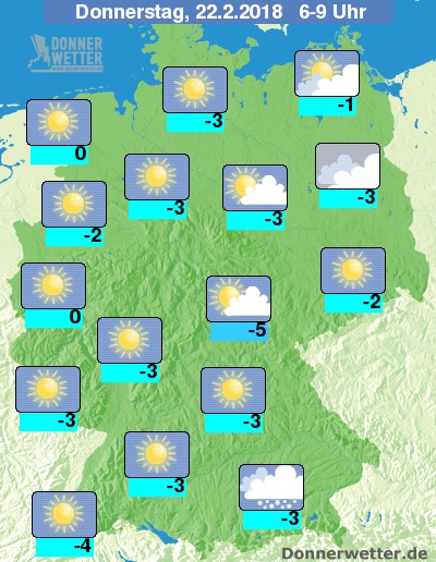 Der Donnerstag startet in weiten Landesteilen heiter oder sonnig, dichtere Wolken dominieren meist nur im äußersten Nordosten sowie am Alpenrand. Hier können zudem einzelne Schneeschauer fallen.