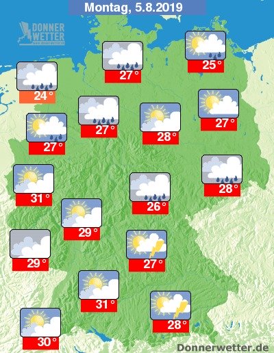 Am Montag zeigen sich teils heitere Abschnitte, teils ziehen allerdings dichte Wolken durch, dabei bilden sich gebietsweise Schauer und lokal auch Gewitter. Die Temperatur steigt auf 24 Grad in Bremerhaven und bis 31 Grad in Stuttgart.