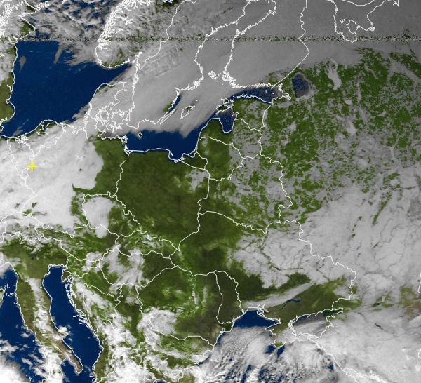 Auf dem Satellitenfoto von heute Morgen zeigte sich Deutschland zum Großteil unter eine meist hochnebelartigen Wolkenschicht, nur die östlichen Landesteile waren verbreitet auch wolkenlos. Freundliches und trockenes Wetter herrscht vor allem in Osteuropa. In Nordeuropa sorgen die Ausläufer eines Tiefs über dem Nordmeer für nasses und kaltes Wetter.
