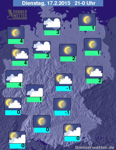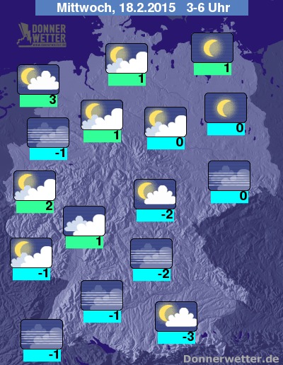 In der Nacht zum Mittwoch ist es im Norden und Westen noch gebietsweise stark bewölkt, dazu bleibt es aber meist trocken. Im übrigen Land ist es zumeist locker bewölkt oder sternenklar und dabei trocken, jedoch bildet sich stellenweise Nebel oder Hochnebel. Die Tiefstwerte liegen bei 3 Grad in Bremerhaven und -3 Grad im Alpenvorland.
