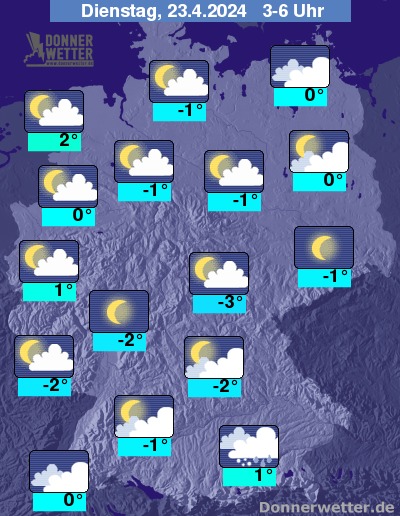 Die Temperaturen gehen in den frühen Morgenstunden auf Werte um 2 bis -3 Grad zurück. Verbreitet ist mit mäßigem Bodenfrost zu rechnen.