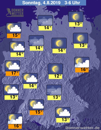 In der folgenden Nacht sind im Süden und Südosten noch letzte Schauer möglich, sonst ist es über der Nordhälfte bereits verbreitet sternenklar oder nur locker bewölkt und dazu trocken. Im Süden und Südwesten ziehen hingegen die ganze Nacht hindurch oft lockere oder noch aufgelockerte Wolken durch. Die Temperatur sinkt auf 17 Grad in Köln und bis 12 Grad am Thüringer Wald.