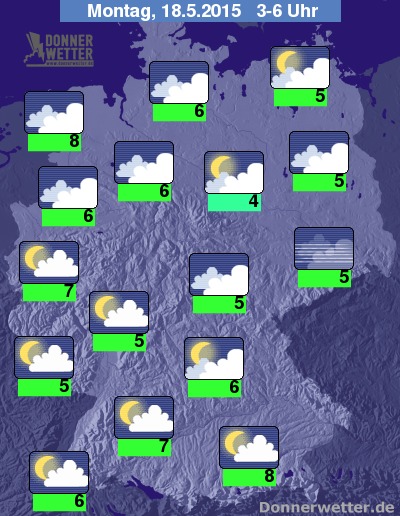 In der Nacht zum Montag zeigt sich der Himmel meist locker bis aufgelockert, im Norden teils schon stark bewölkt, dazu bleibt es trocken. In der zweiten Nachthälfte ziehen sich die Wolken im Norden, vor allem aber im Nordwesten zu und dabei ist im Küstenumfeld der Nordsee auch Regen möglich, sonst bleibt es weiterhin trocken. Die Temperatur sinkt auf 8 Grad im nördlichen Emsland und bis 4 Grad am Fläming.
