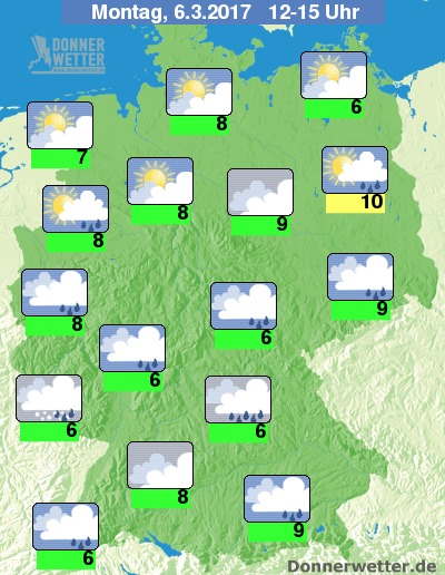 Heute Nachmittag bleibt es über dem Bundesgebiet verbreitet stark bewölkt und Auflockerungen zeigen sich eher selten, dagegen fällt immer wieder, oft schauerartiger Regen. Die Temperatur liegt bei 6 Grad im Saargau und etwa 10 Grad in Berlin.
