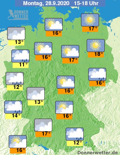 Die Temperaturen erreichen am verregneten Niederrhein am Nachmittag nur Werte um 11 Grad, am wärmsten wird es mit Temperaturen um 18 Grad rund um Berlin.