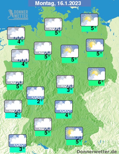 Am Montag ist es im Osten und Südosten noch oft heiter und dabei trocken. Im übrigen Bundesgebiet ist es dagegen überwiegend bedeckt und von Westen her setzt Regen, Schneeregen oder Schneefall ein. Bis zum Abend bleibt es im Nordosten, Osten und Südosten noch weitgehend trocken. Die Temperatur erreicht 2 Grad in Wiesbaden und bis 6 Grad in Dresden. Im Norden weht ein teils stürmischer Wind, an der Nordsee herrscht Sturm.