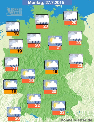 Am Montag ziehen meist dichte Wolken durch und es bilden sich verbreitet Schauer, vor allem im Norden und Osten auch einzelne Gewitter. Auflockerungen sind am ehesten im Süden, hier und da aber auch in der Mitte Deutschlands möglich. Die Temperatur liegt bei 18 Grad an der Nordsee und bis 23 Grad in München.