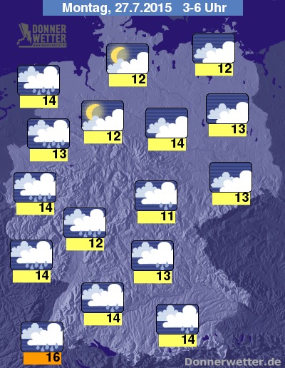 In der Nacht zum Montag bleibt es im Nordosten und teils im Norden der Republik weitgehend trocken bei jedoch überwiegend starker, teils auch aufgelockerter Bewölkung. Im übrigen Bundesgebiet ziehen hingegen dichte Wolken durch und es fällt immer wieder Regen. Im Süden bilden sich häufig Schauer und auch einzelne Gewitter. Die Temperatur sinkt auf 16 Grad in Freiburg und etwa 11 Grad im Eichsfeld.