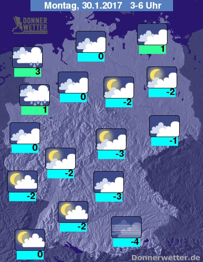 In der bevorstehenden Nacht ziehen dichte Wolken mit Regen, teils auch mit Schneeregen in den Nordwesten und Westen Deutschlands, stellenweise ist hier mit Glätte zu rechnen! Ebenfalls oft stark bewölkt ist es vom Norden, über den Nordosten bis in den Osten des Landes, hier bleibt es jedoch weitgehend trocken. Freundlicher und meist locker oder aufgelockert bewölkt ist es vom Süden bis in die Mitte Deutschlands, hier bleibt es trocken. Die Temperatur sinkt auf 3 Grad an der Nordsee und bis -4 Grad in Augsburg.