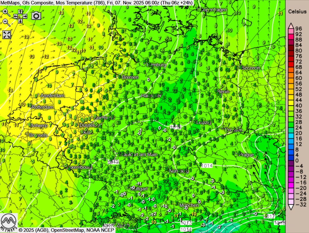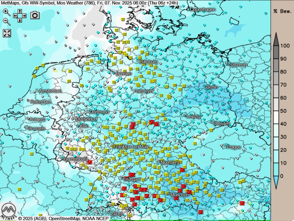 Die Strömungs- / Temperatur- sowie die Wetterkarte für Freitagfrüh (06:00 Uhr) nach GFS: