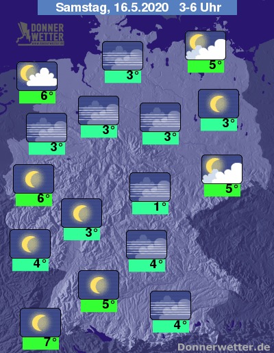 Bis zu den Frühstunden kühlt die Luft auf 7 bis 1 Grad ab. Es muss allerdings nochmals recht verbreitet mit Bodenfrösten gerechnet werden, stellenweise kann es auch zu leichten Frösten in 2 Meter Höhe kommen.