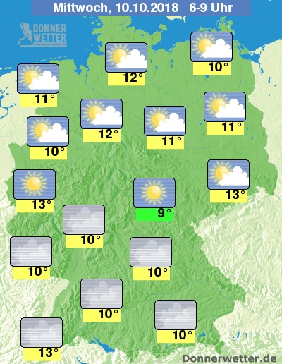 Die Temperaturen erreichen Werte um 9 Grad C in den hohen Lagen der Mittelgebirge und um 13 Grad C in Dresden.